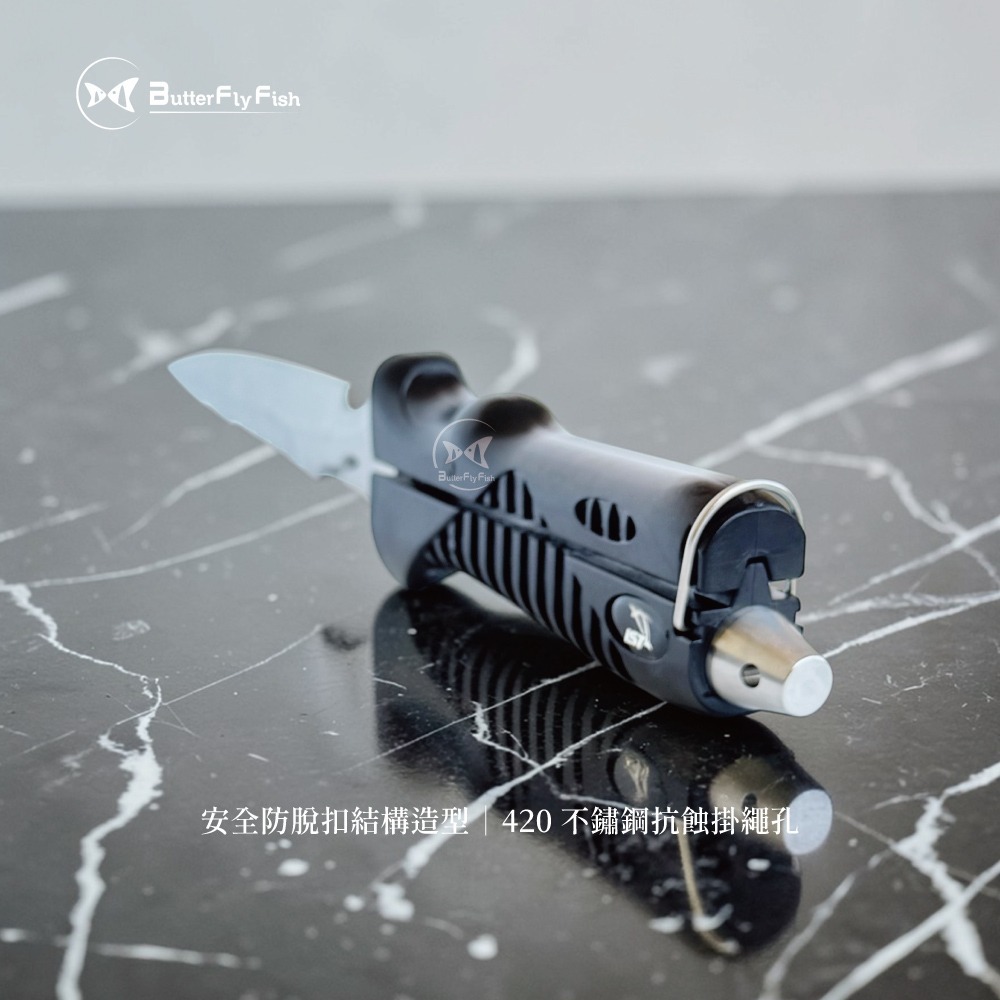高效救生構造: 主刀刃設有割線勾: 遇細網、魚線可快速勾斷。